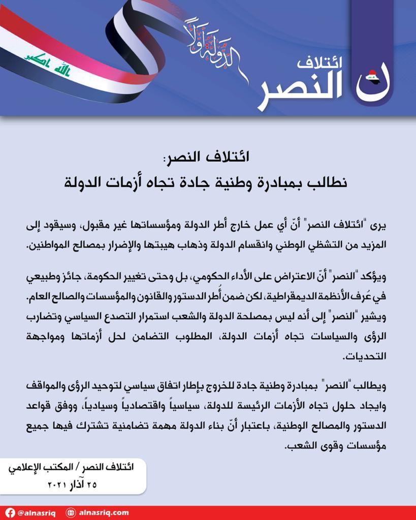 • ائتلاف النصر: نؤكد على ضرورة وضع حد لجميع المبررات الداخلية والخارجية التي تعرّض البلاد للخطر